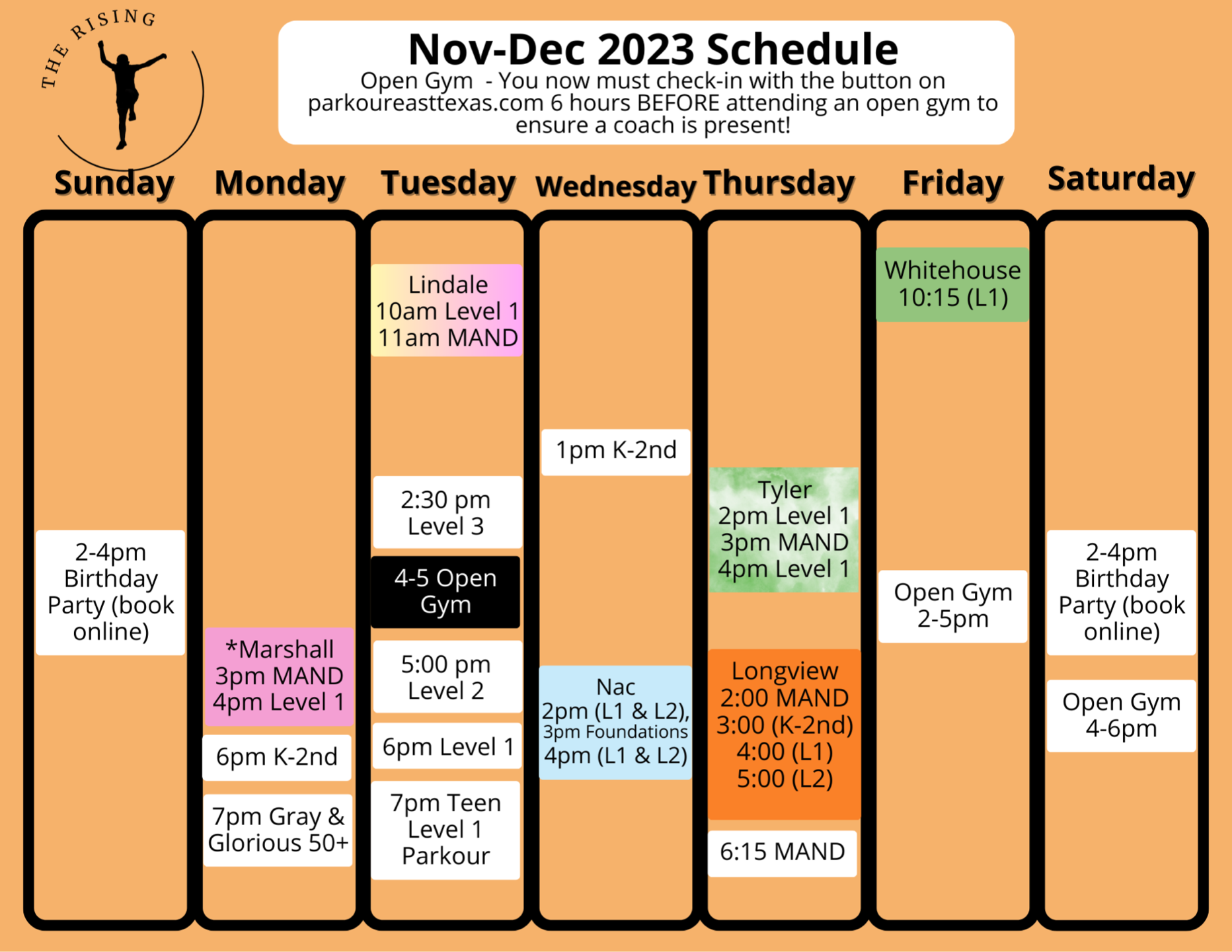 With an emphasis on safety, fun, and structured progression, students will learn how to run, jump, vault, and climb with confidence. No prior experience required—just a willingness to move!